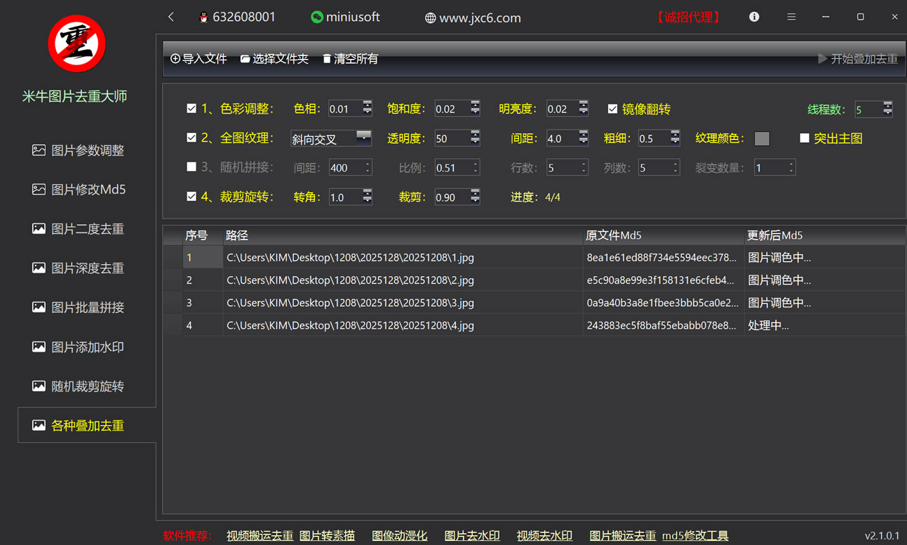 关键词:图片去重工具、批量修改MD5、图片纹理生成、深度去重、图片随机拼接、批量添加水印、图片旋转裁剪、多线程图片处理、图片裂变工具