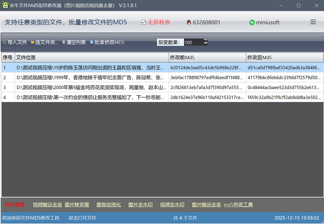 批量修改MD5、MD5修改器、文件去重、图片去重、视频去重、音频去重、原创度提升、流量提升、批量裂变文件、文件MD5一键修改、MD5快速修改、多文件MD5修改、SEO原创工具、平台检测规避、内容去重软件